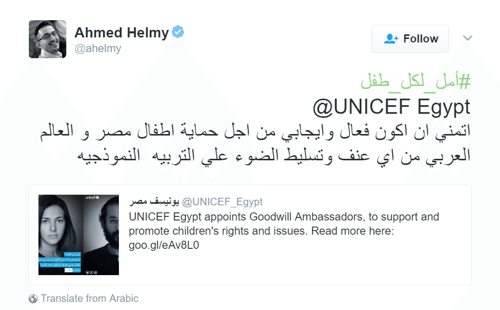 الأمر اللذي عبر عنه الفنان أحمد حلمي بتمنياته ان يكون فعال وايجابي من اجل حماية اطفال مصر