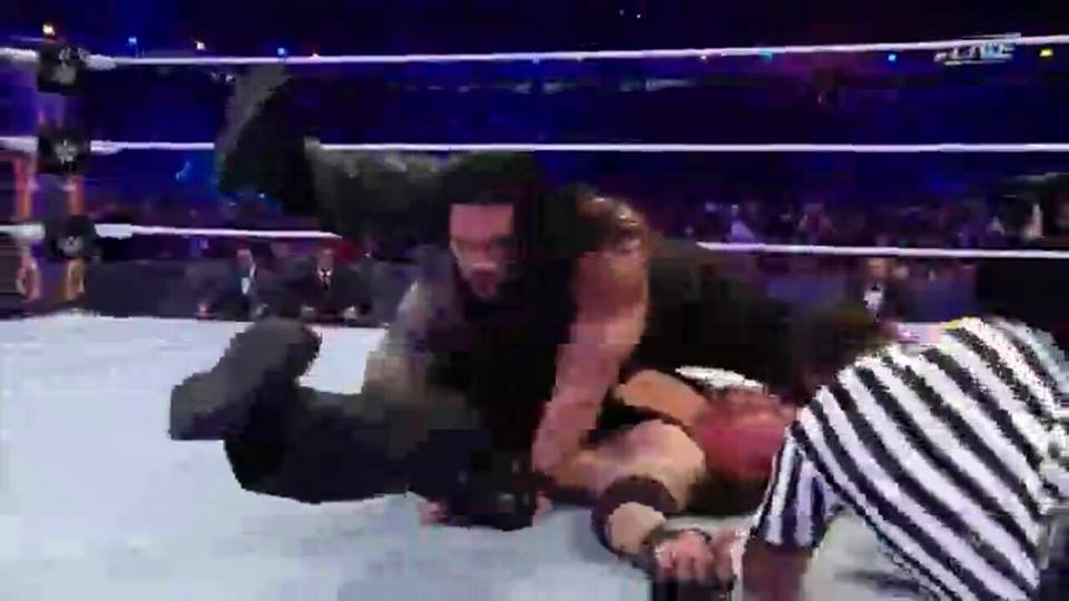 ضربة رومان رينز كانت كفيلة بطرح أندر تيكر أرضًا، لكي يحضر له الضربة الحاسمة.