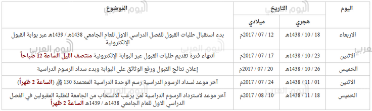 موعد القبول بالفصل الدراسي الأول بمرحلة البكالوريوس لعام 1438/1439