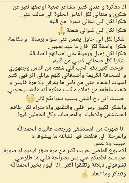 ووجهت الفنانة ، رسالة مؤثرة لجمهورها وأصدقائها، عبر حسابها على موقع “تويتر”، قالت فيها: “أنا متأثرة وعندي كتير مشاعر صعبة أوصفها لأعبر عن شكري وامتناني لكل الناس الحلوة اللي سألت عني، شكرًا لكل اللي دعالي دعوة من قلبه”.
