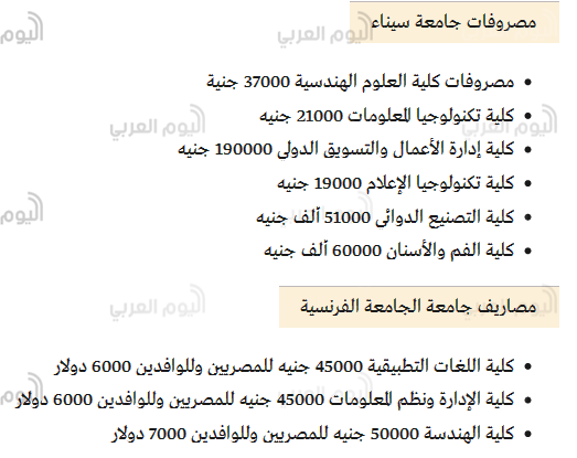 ومصاريف الجامعات الخاصة تشمل كل من الكليات التالية “الجامعة الكندية، الجامعة البريطانية، جامعة فاروس، جامعة سيناء، جامعة المستقبل، جامعة النهضة، الجامعة الفرنسية، جامعة المستقبل، جامعة مصر الحديثة، مصاريف جامعة مصر الدولية.
