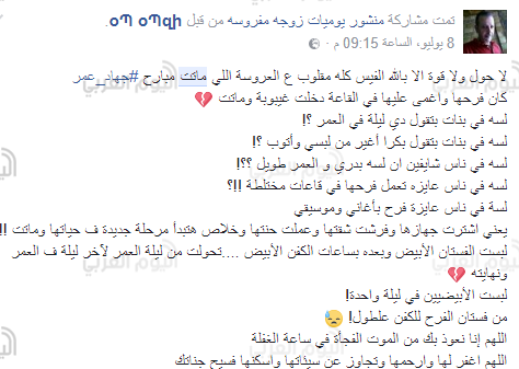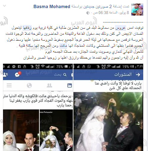 وقالت بسمه محمد: “توفيت عروس من سمالوط البلد فى سن العشرين طالبة في كلية تربية يوم زفافها ليتحول الفستان الابيض الى كفن وذلك بعد دخول القاعة والتهنئة من الحاضرين والفرحة تملا الوجوة قامت العروسة ترقص مع صحباتها فى ليلة العمر فوجأ الجميع بسقوط العروسة مغميا عليها وسط ذهول الجميع”.